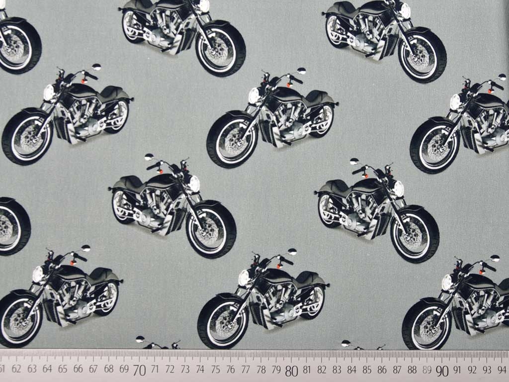 Ein toller weicher Baumwolljersey aus dem Hause Stenzo mit süßem Hund auf einem Motorrad in grünstichigem Grau und passendem Kombistoff. Ein Panel ist 69 cm hoch. Das Hauptmotiv ist ca. 24 x 25 cm groß. Neben dem Hauptmotiv, welches auf einer Breite von 75 cm ist, gibt es den passenden Kombistoff mit kleineren Motorrädern auf ebenfalls 75 cm Breite.