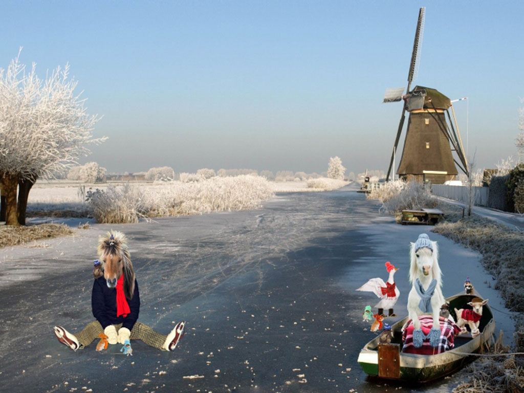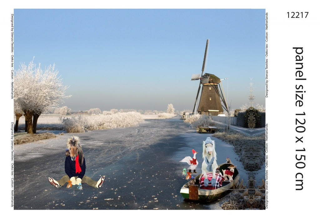 Ein toller weicher Baumwolljersey aus dem Hause Stenzo in grau mit 2 süßen Pferdemotiven. Ein Panel ist ca. 119 cm hoch. Auf einer Hälfte der Stoffbreite ist ein Pferd mit Schlittschuhen und auf der anderen Hälfte ist ein schönes Windmühlenmotiv mit einigen Bauernhof-Tieren im Boot davor. Das Schlittschuh-Pferd ist ca. 32 x 35 cm groß und die Windmühle ca. 48 x 26 cm.