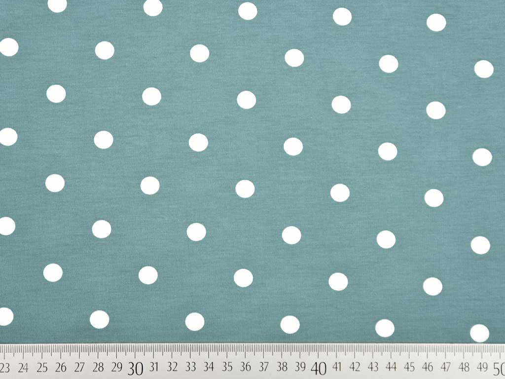 Ein weicher, altmintfarbener Jersey mit weißen Punkten. Die Punkte haben einen Durchmesser von 1 cm.
