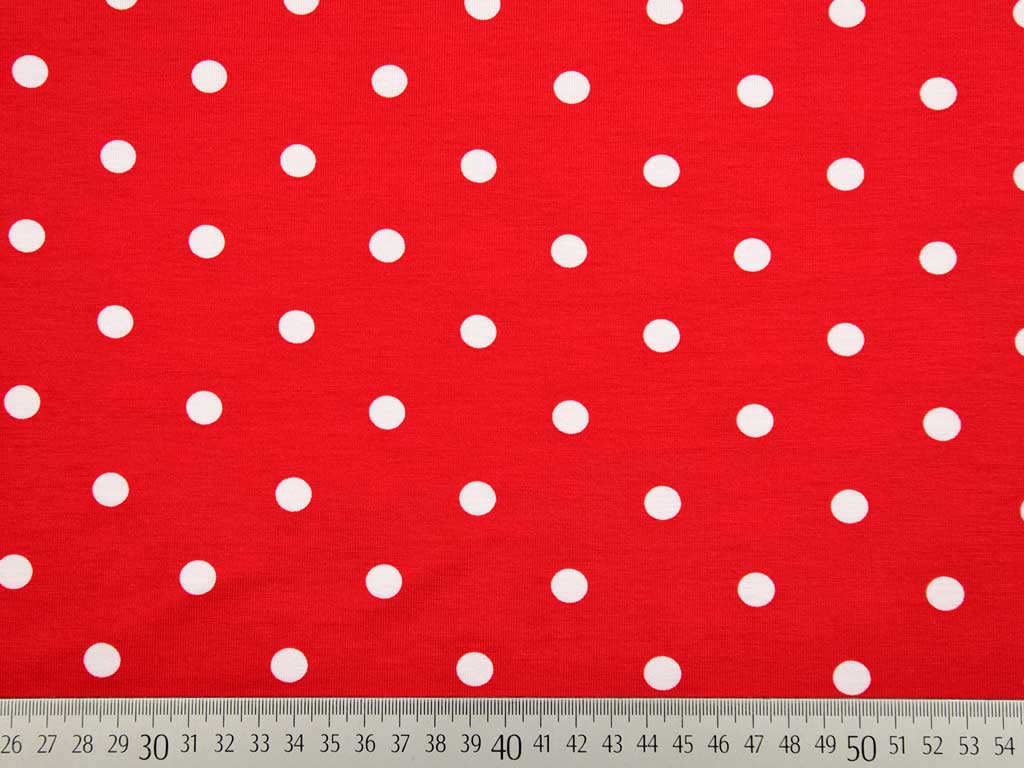 Ein weicher, roter Jersey mit weißen Punkten. Die Punkte haben einen Durchmesser von 1 cm.