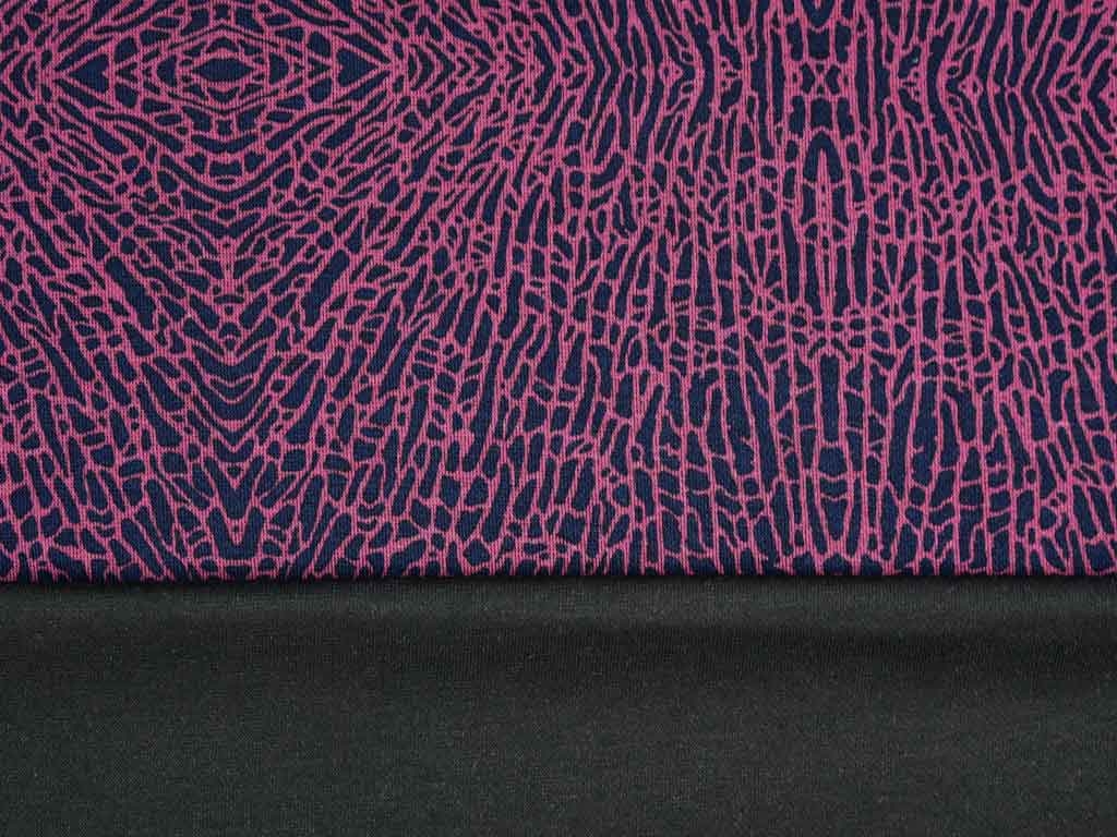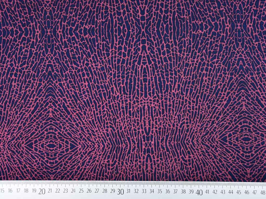 Ein weicher Punta di Roma Jersey in tief dunkelblau mit einem grafischen Muster, das an Animalprint erinnert. Das Muster ist bordeauxrot.