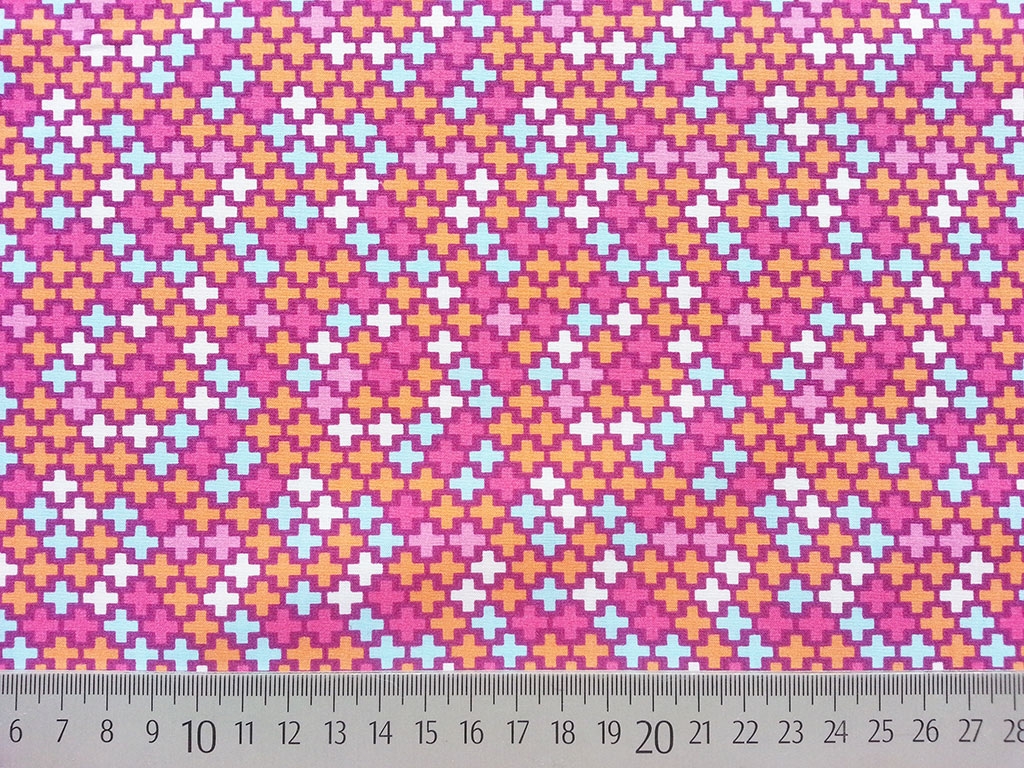 Ein bordeauxroter Jersey mit dem Namen "Criss Cross" aus der Serie Kamehameha von Hamburger Liebe mit kleinen Kreuzen in orange, rosa, hellblau und weiss. Produziert von Hilco in bekannt hochwertiger Qualität.