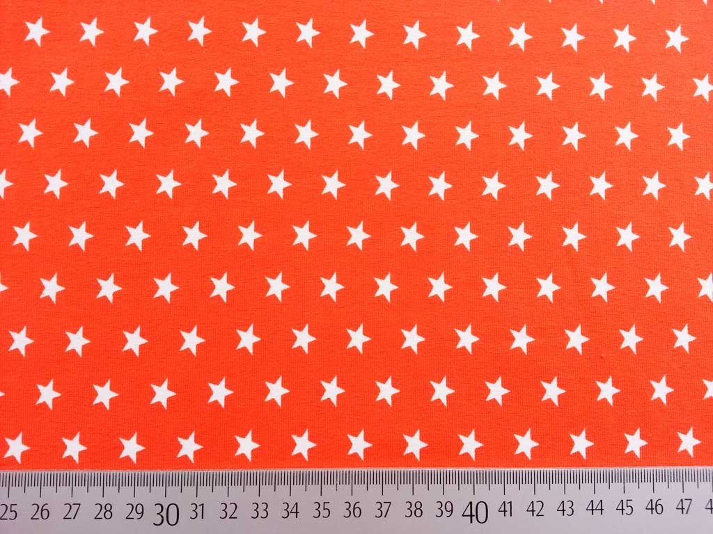 Ein weicher Baumwolljersey in orange mit 1 cm großen Sternen in weiss.