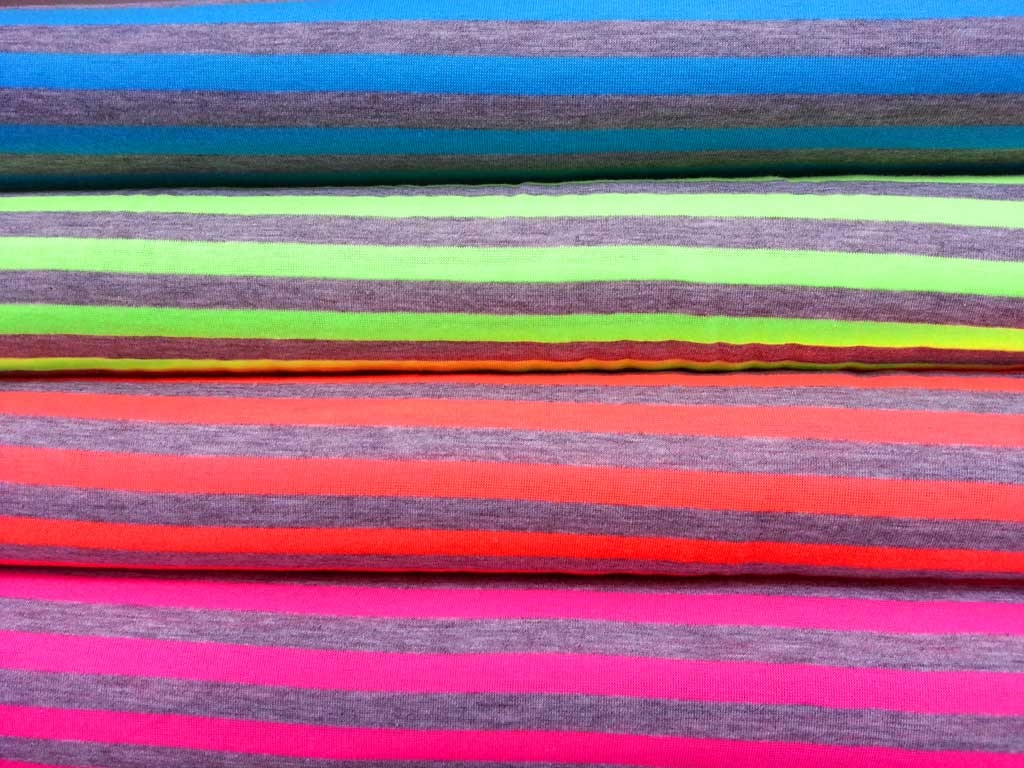 Ein sportlicher Jersey mit neon gelben Streifen auf grau melange. Die Streifen sind 1 cm breit.