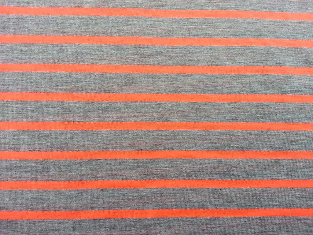 Ein sportlicher Jersey mit neon orangen Streifen auf grau melange. Der orange Streifen ist 0,5 cm breit, der graue 1,7 cm.