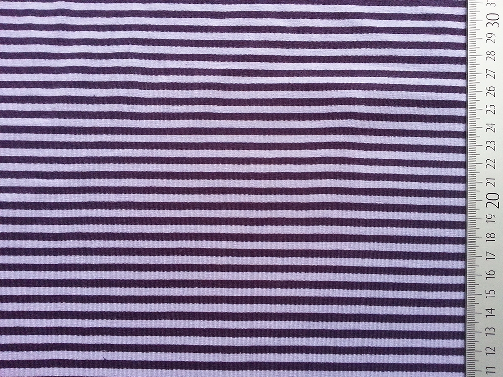 Ein weicher, hochwertiger Ringeljersey mit 2mm breiten Streifen in lila und helllila.