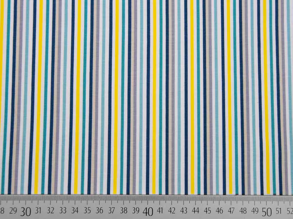 Ein frischer Baumwolljersey in weiß mit schmalen Streifen gelb, aquamarin, dunkelblau, mint und grau.