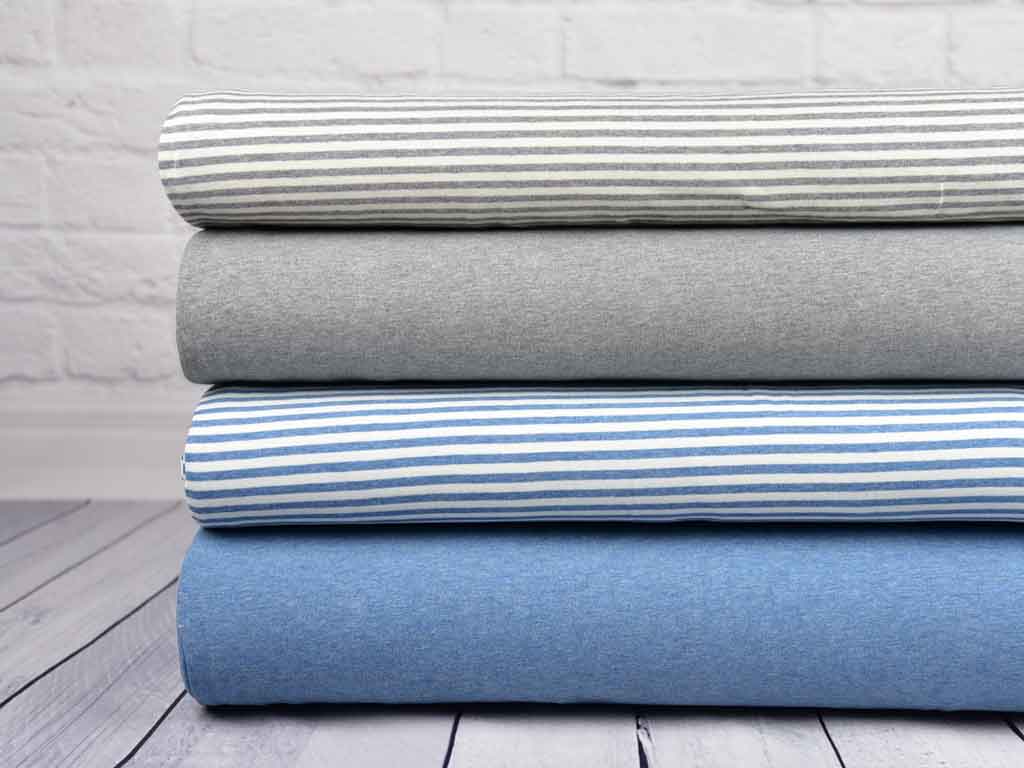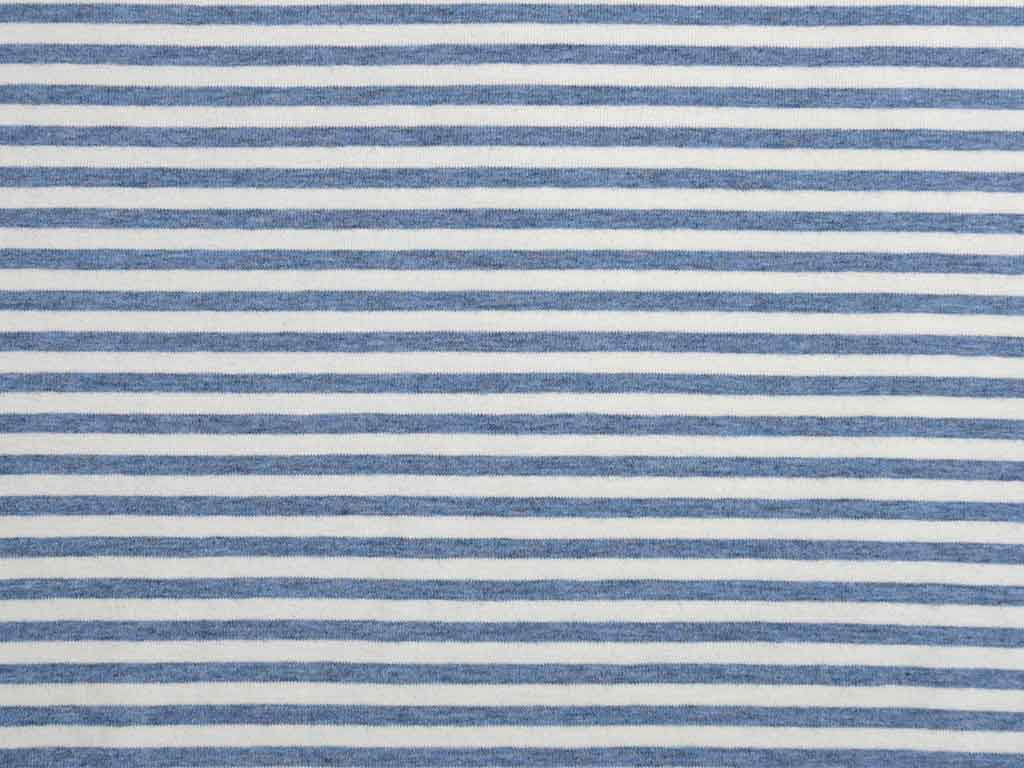 Ein hellblau melierter Jersey mit weißen garngefärbten Streifen (0,4cm). Die Oberseite ist angeraut und hat somit einen wunderbar weichen Griff.
