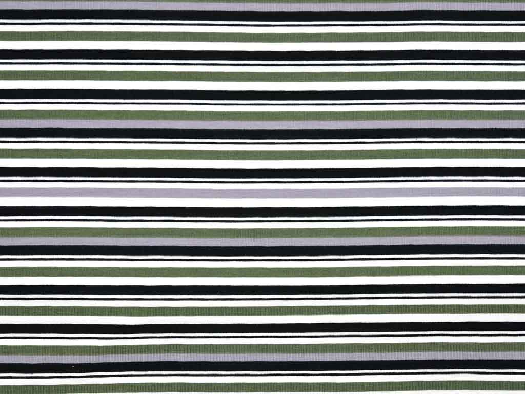Ein weicher Jersey mit unterschiedlich dicken Streifen in weiß, schwarz, grau und khaki.