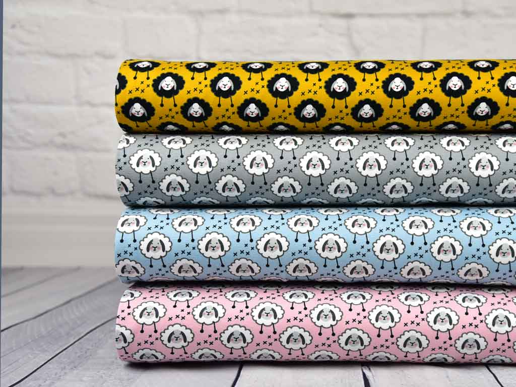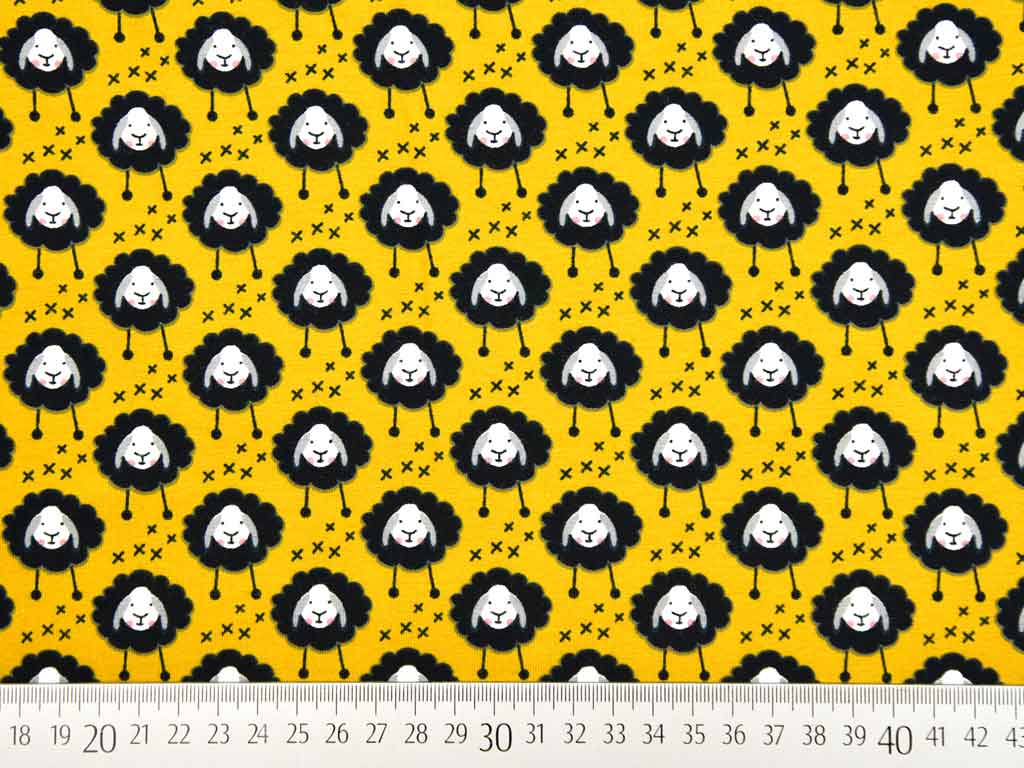 Ein süßer, weicher Bio-Jersey aus dem Hause Stenzo in ocker mit schwarzen Schafen und kleinen Kreuzen.