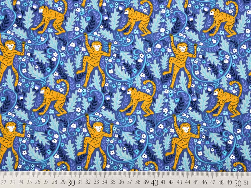Ein jeansblauer Baumwolljersey mit ockergelben Affen und hellblauen und dunkelblauen Blättern und Zweigen.