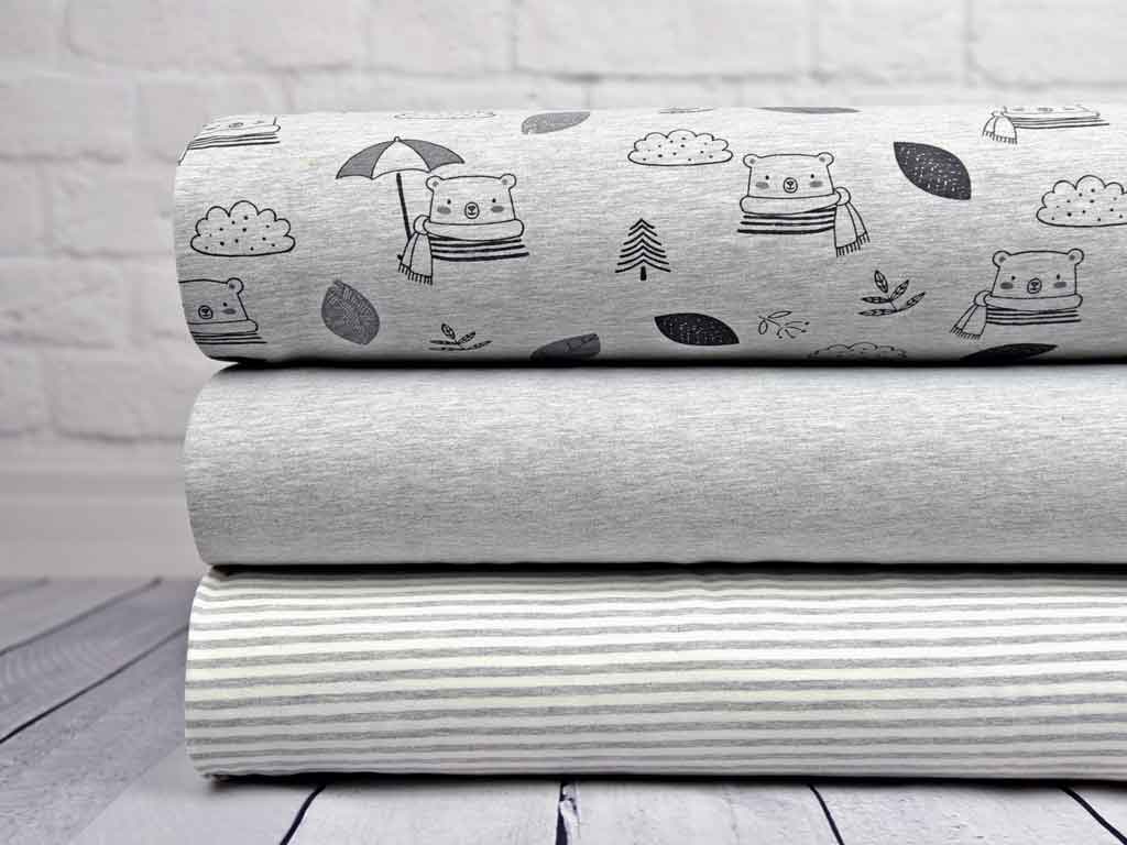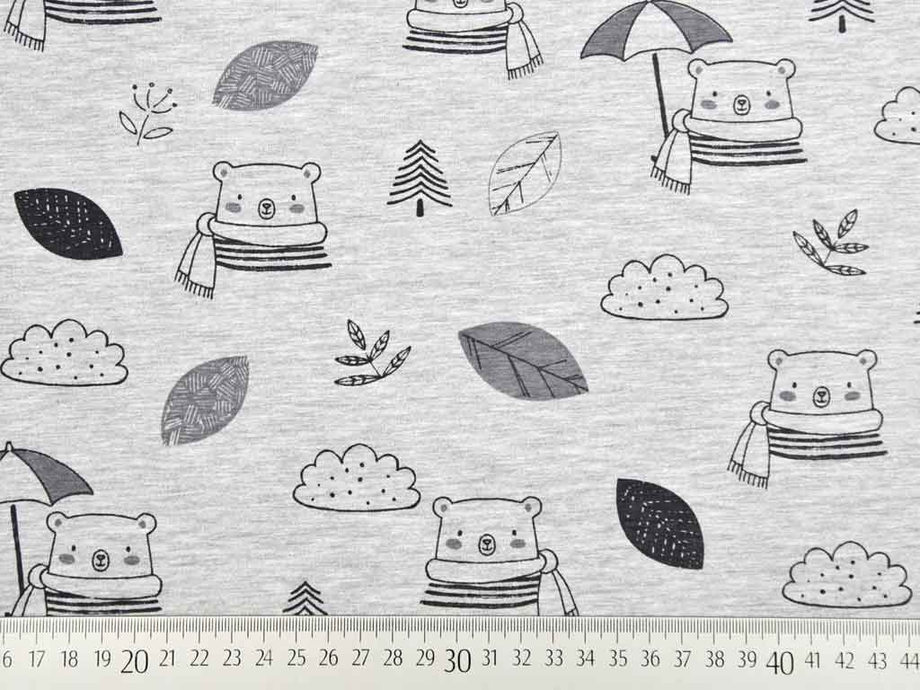 Ein kuschelweicher Jersey mit leicht samtiger Oberfläche in grau meliert mit Bären, Blättern und Wolken in dunkelgrau. Die Vorderseite ist leicht angeraut, somit ensteht die weiche Haptik.