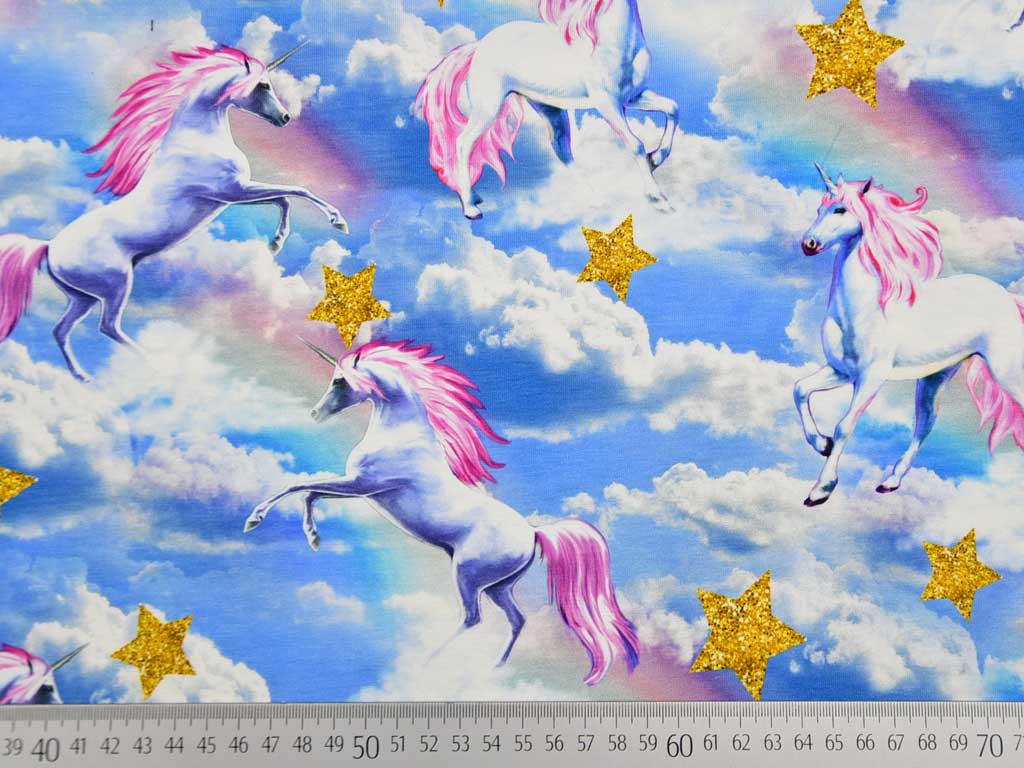 Ein weicher Baumwollstretchjersey als Digitaldruck mit gestochen scharfen Einhörnern, Wolken und goldfarbigen Glitzersternen.