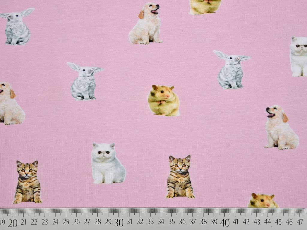 Ein weicher Baumwolljersey in rosa mit Katzenmotiv zum Ausschneiden und Applizieren plus Kombistoff mit niedlichen Tieren wie Hamstern, Katzen, Hunden und Hasen. Die Katze zum Ausschneiden ist 9x13 cm groß ohne Zugabe für Ausschnitt.