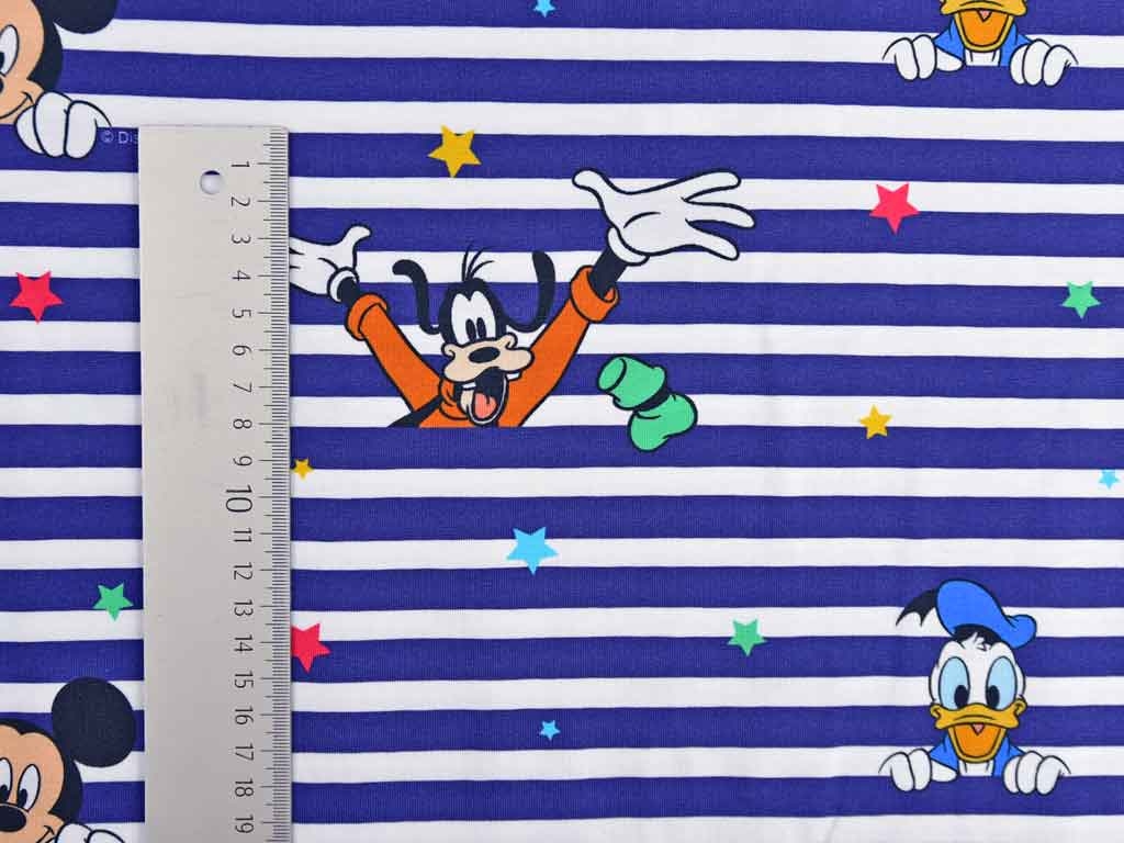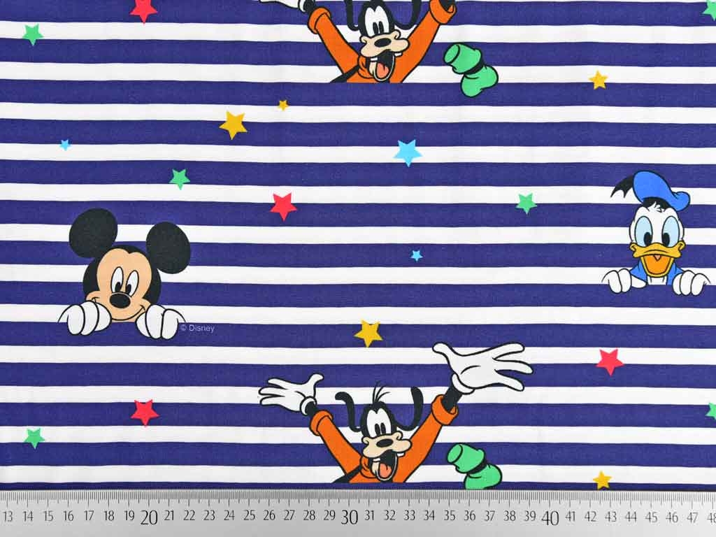 Ein dunkelblau weiß gestreifter Baumwolljersey von Disney mit dem Hund Pluto, Mickey Mouse und Donald Duck sowie kleinen roten, gelben, blauen und grünen Sternen.