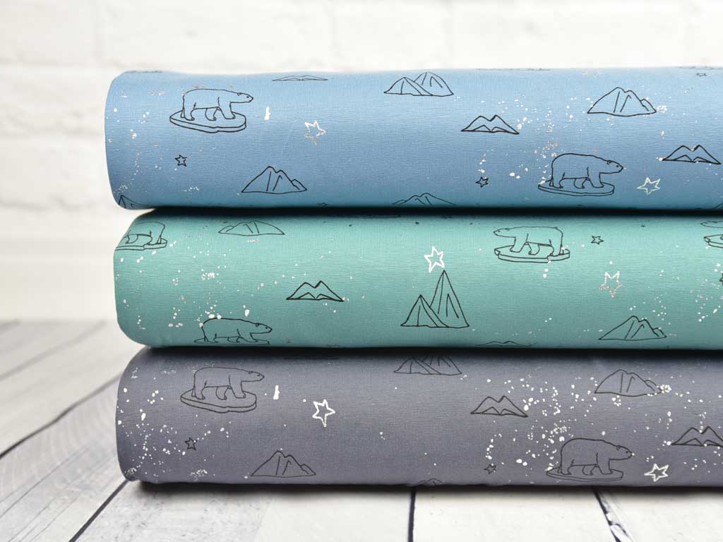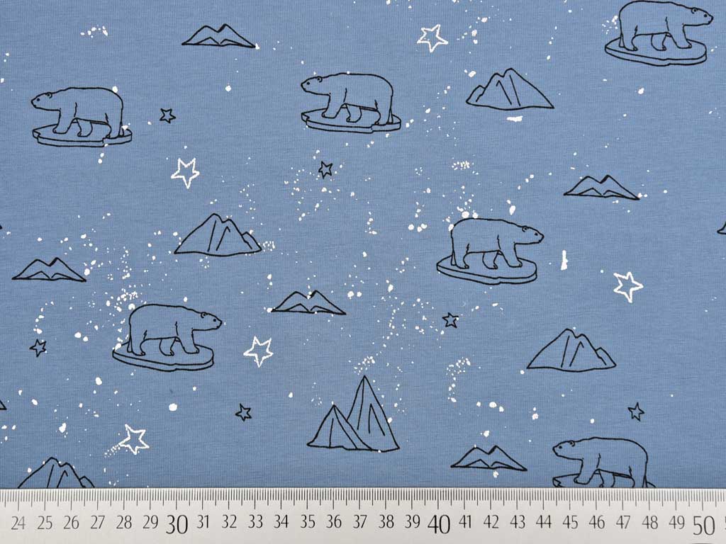 Ein weicher Baumwolljersey in rauchblau mit schwarzen Eisbären und Bergen als Kontur und silberfarbigen Glitzer-Sternen.