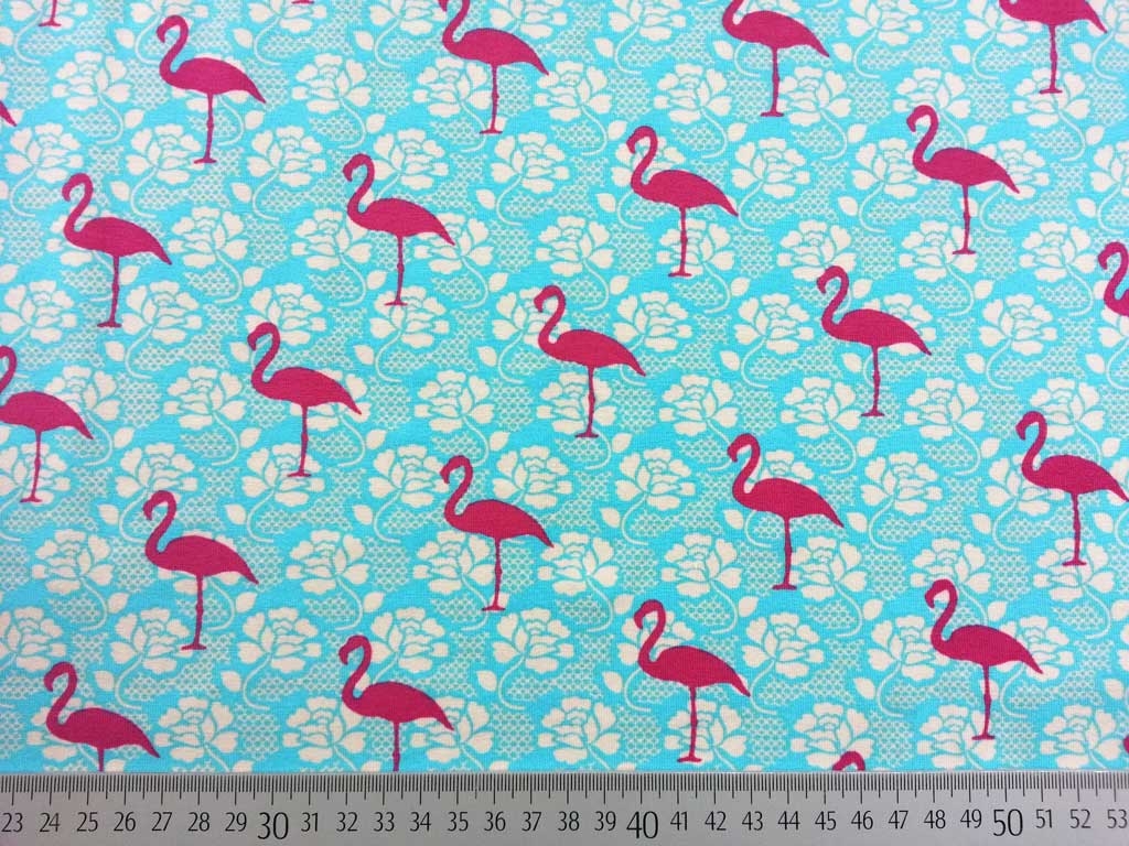 Ein wunderschöner Jersey von Megan Blue mit pinken Flamingos auf türkis und cremefarbenem Spitzendruck. So süß!