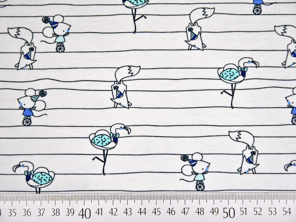 Ein weicher gestreifter Baumwolljersey in hellstem Grau mit helltürkisen Flamingos und Mäusen. Ein super süßer Kinderstoff.