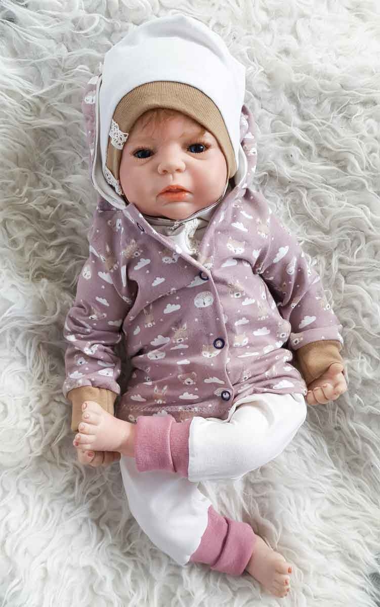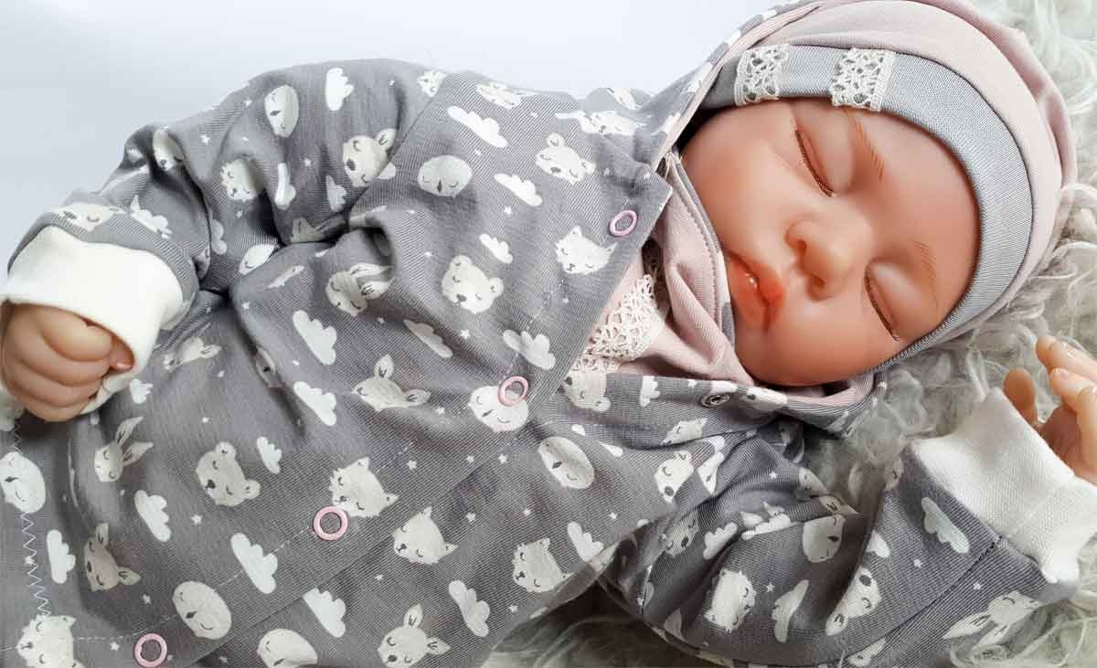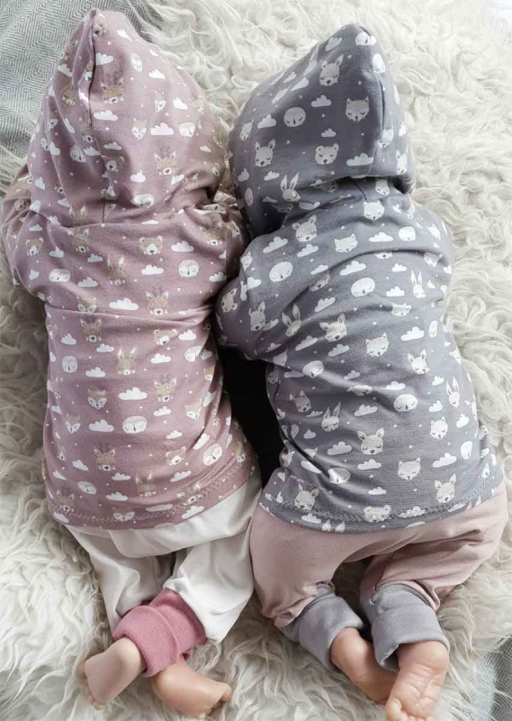 Ein weicher, mittelgrauer Jersey mit süßen, hellbeigen Tiergesichtern verschiedener Waldtiere z.B. Füchse, Hasen, Bären und cremeweißen Wolken.