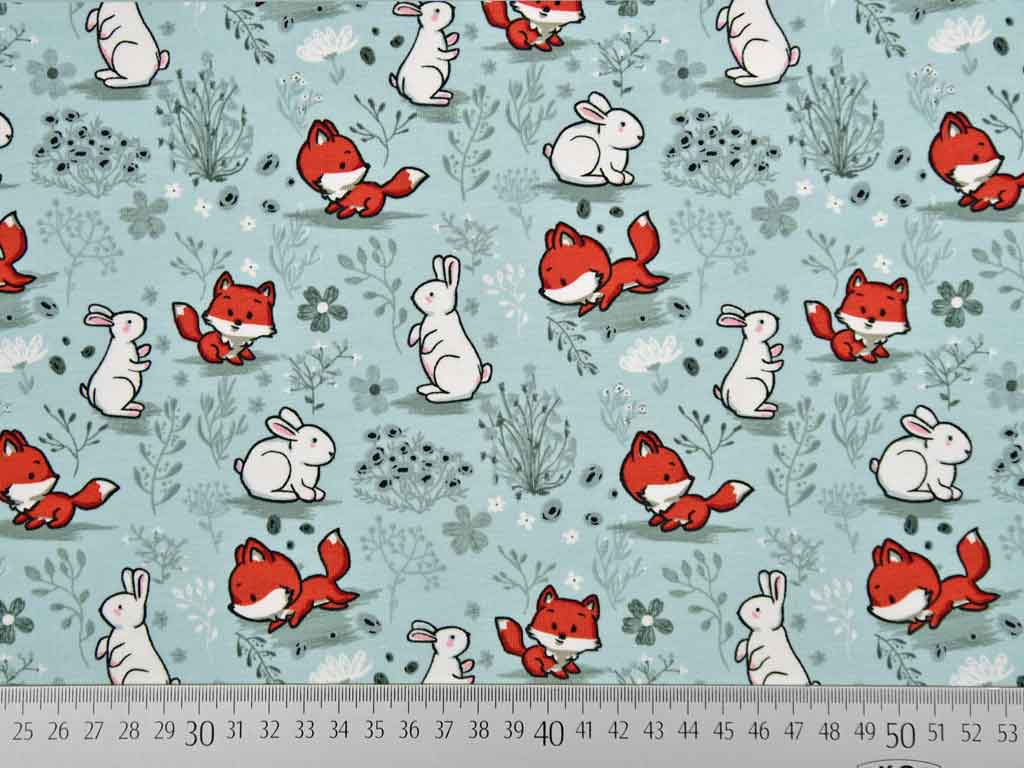 Ein sehr süßer Jersey in mint mit Füchsen, Hasen und Blumen in rostrot, weiß und hellgrau.