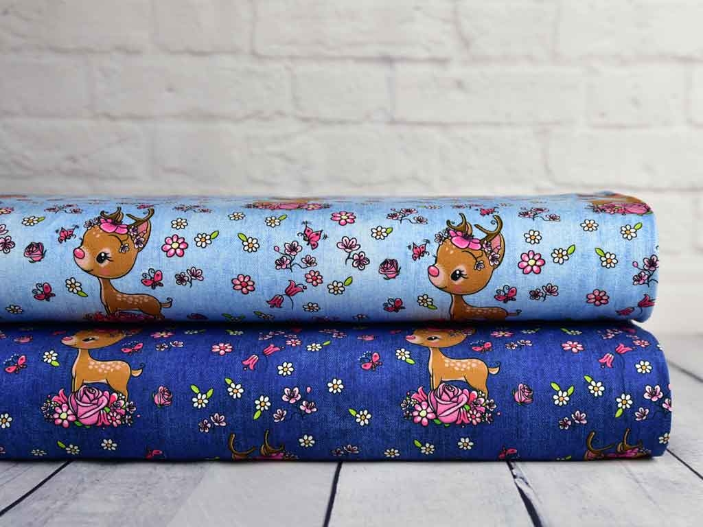 Ein hellblauer Baumwolljersey als Jeanslook mit niedlichen, hellbrauen Rehen, weiß-geben Margeriten, rosa-pinken Blumen und Schmetterlingen.
