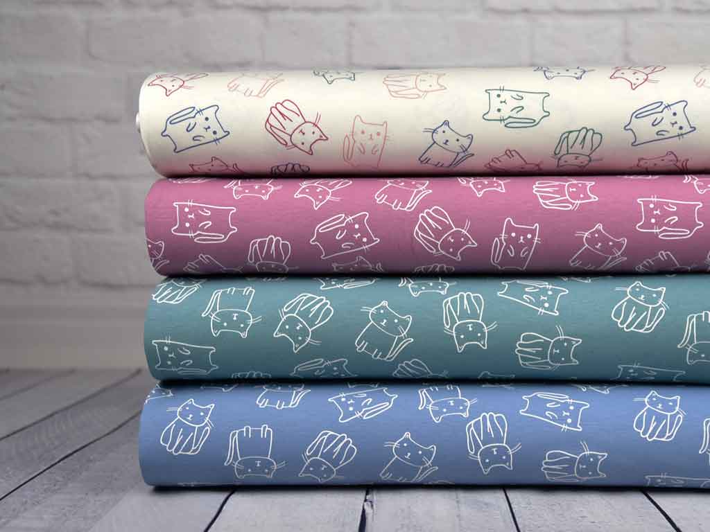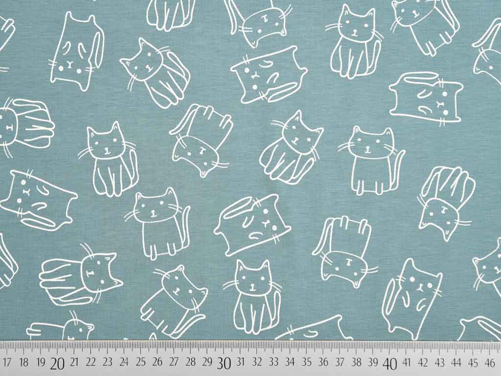 Ein weicher, altmintfarbener Jersey mit niedlichen weißen Doodle Katzen (Kontur).