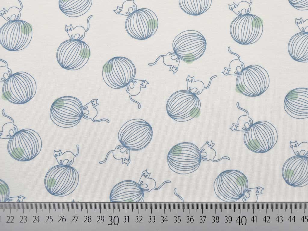 Ein weicher Baumwolljersey von Little Darling in cremeweiß mit jeansblauen Katzen und Bällen. Innerhalb des Balls ist der Kreis hellgrün.