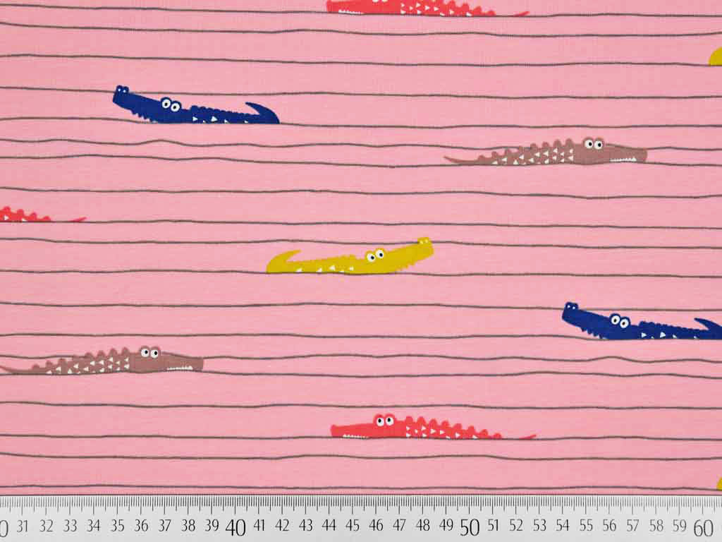 Ein weicher Jersey in lachsrosa mit Krokodilen in senf, dunkelblau und aprikot auf grauen Streifen.