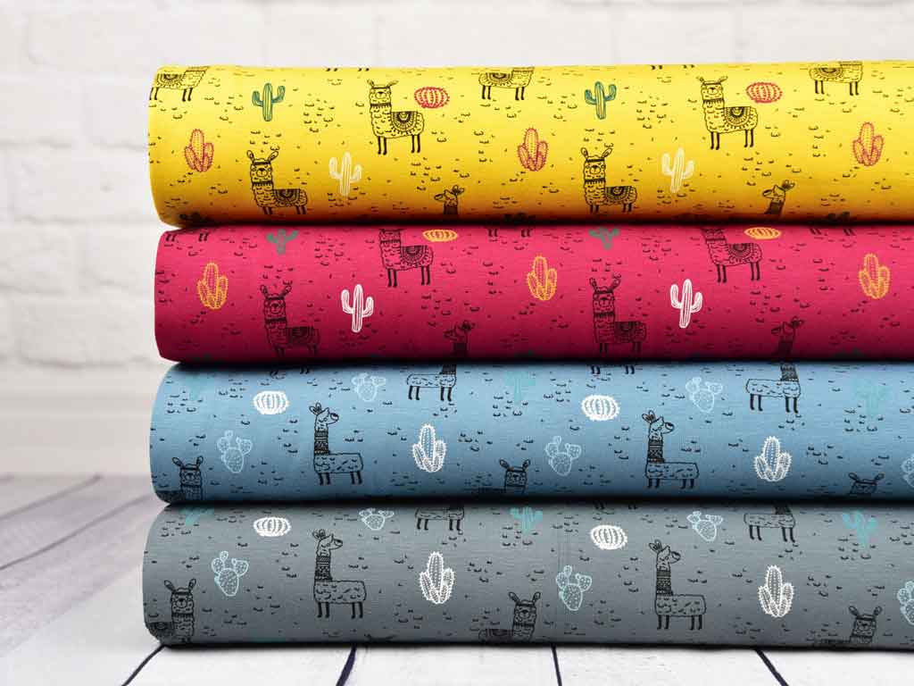 Ein weicher, weinroter Jersey in mit süßen Lamas in schwarz und Kakteen in weiß, ocker, grün und blau.