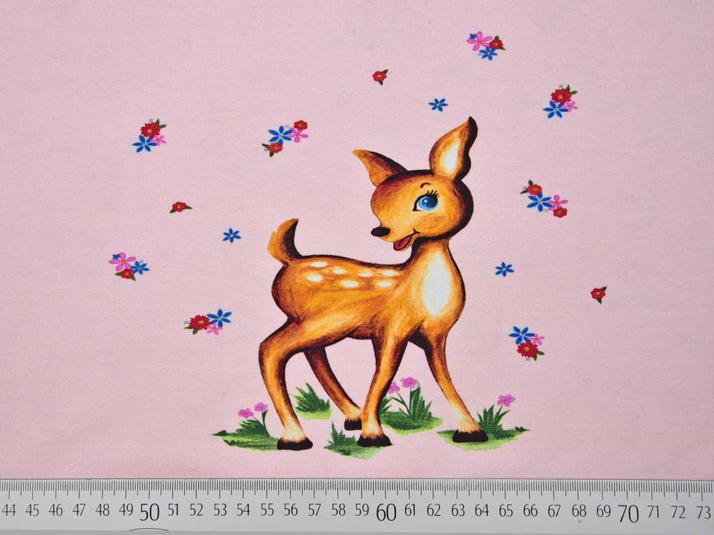 Ein weicher Baumwolljersey in rosa mit 3 verschiedenen Mustern/Motiven. Bei einem Rapport (ca. 48 cm lang) erhält man direkt 3 Stoffe, die zueinander passen (großes Reh, Blümchen mit Vögeln und viele kleine Rehe).