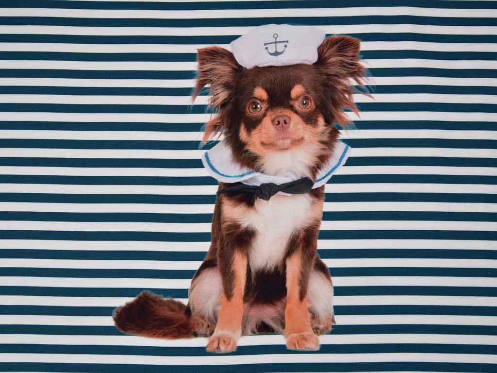 Aus dem Hause Stenzo ein super cooler Paneel-Jersey in petrol-weiß gestreift mit süßem Hundemotiv im Matrosenlook.