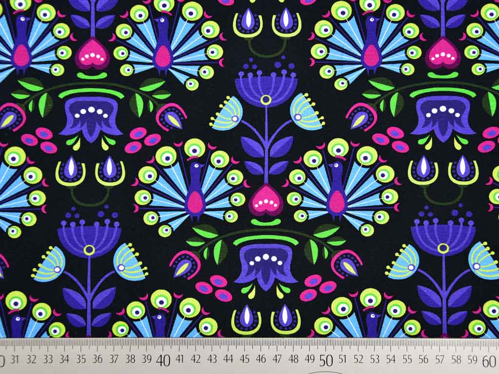 Ein schwarzer Baumwolljersey (My Aunties Martha) von Hamburger Liebe mit Blättern, Blumen und Pfauen in lila, hellblau, pink, hellgrün, dunkellila, dunkelgrün, weiß und grasgrün. Produziert von Hilco in bekannt hochwertiger Qualität.