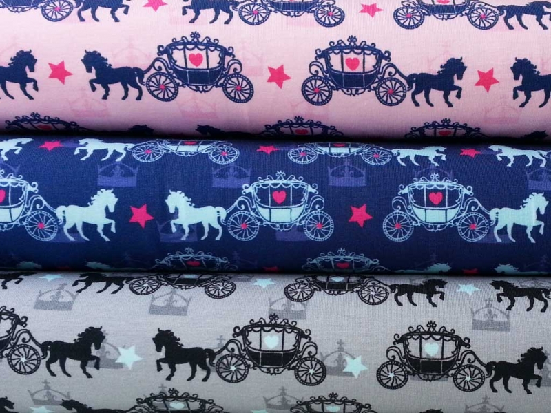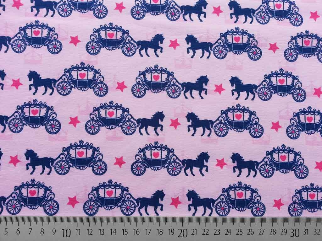 Ein rosa Baumwolljersey namens Odin mit dunkelblauen Pferden und Kutschen sowie pinken Sternen und Herzen und zartrosa Kronen.