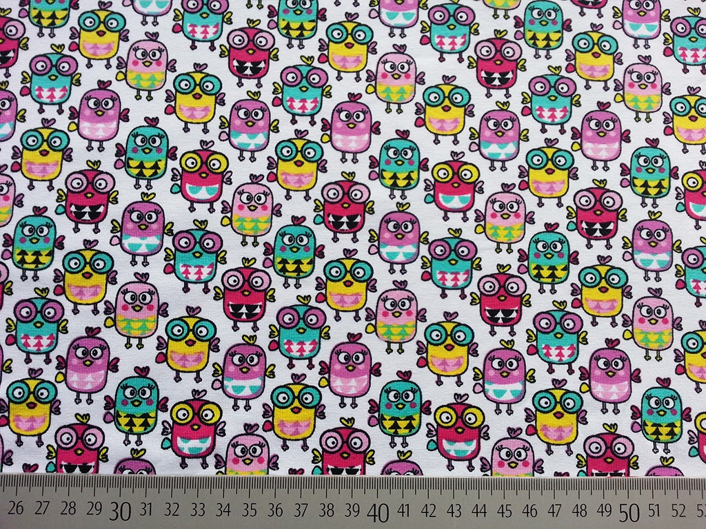 Ein toller Jersey in weiß mit lustigen Vögeln in gelb, rosa, türkis, pink und schwarz.