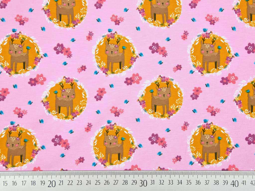 Ein weicher Baumwolljersey in rosa mit Blumen, umrankten Kreisen in ocker und hellbraunen Rehen. Einfach süß!