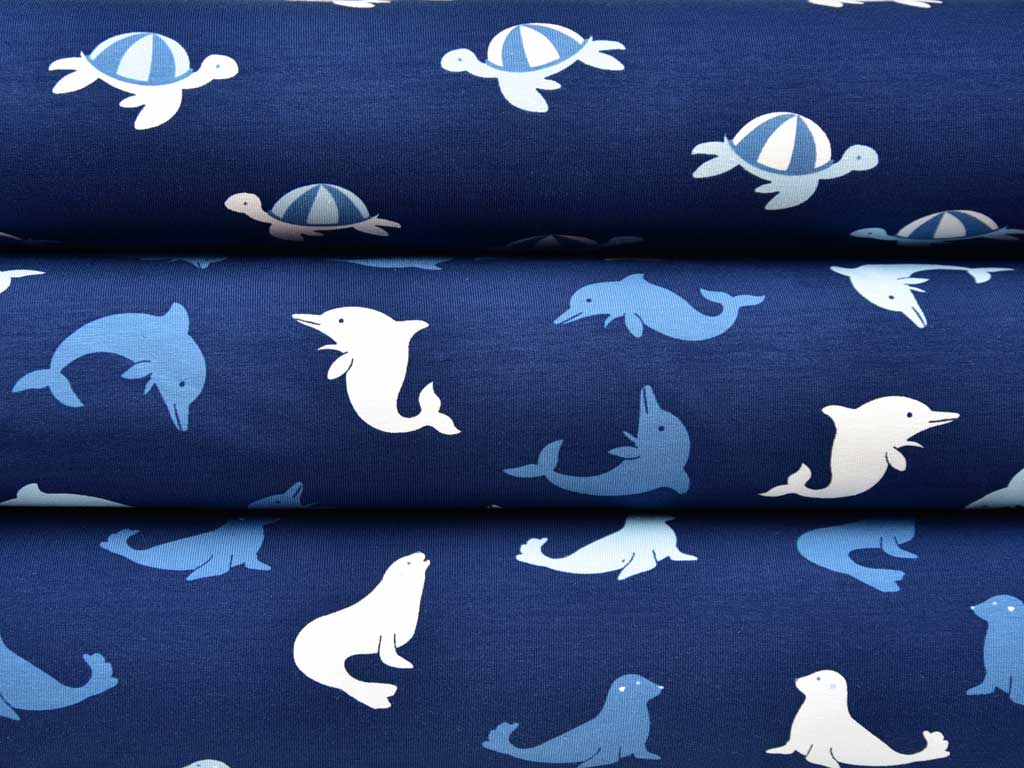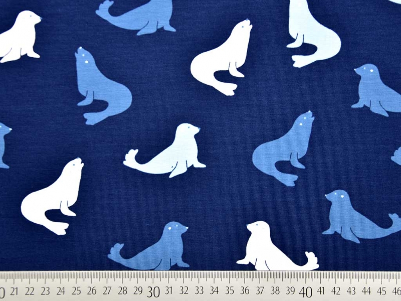 Ein weicher Baumwolljersey in dunkelblau mit süßen Seelöwen in weiss, jeansblau und hellblau.