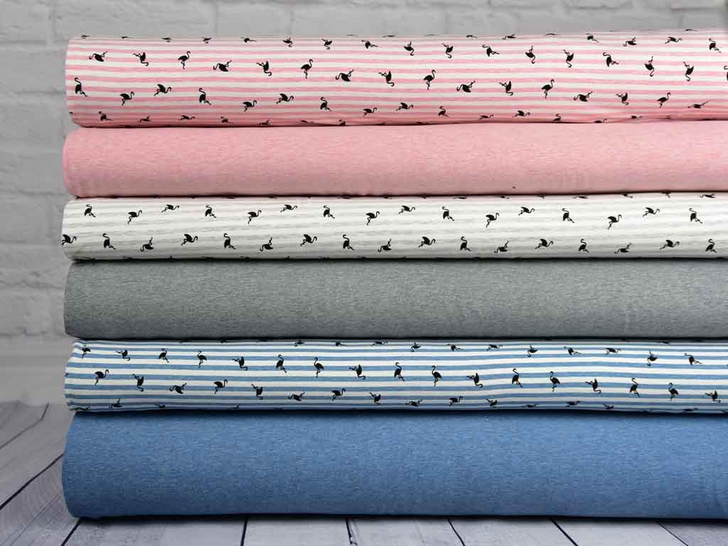 Ein gestreifter Baumwolljersey mit Streifen in cremeweiß und hellgrau melange. Bedruckt ist der Streifen mit kleinen schwarzen Flamingos. Die Oberseite ist angeraut und hat somit einen wunderbar weichen Griff.