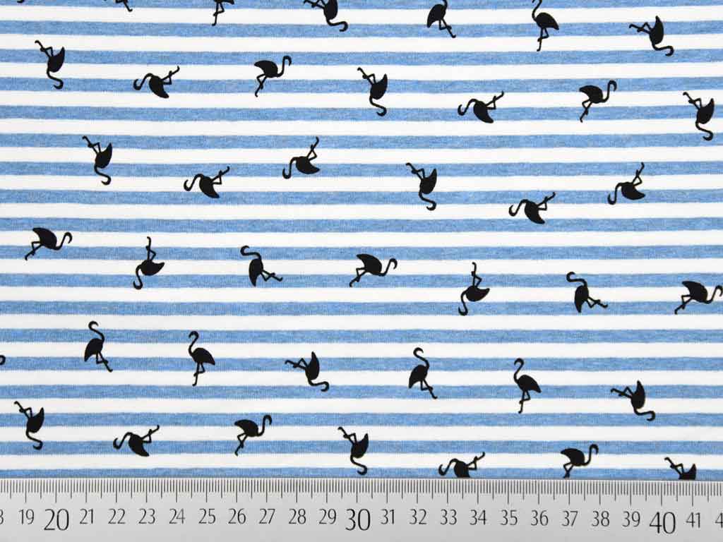 Ein gestreifter Baumwolljersey mit Streifen in cremeweiß und jeansblau melange. Bedruckt ist der Streifen mit kleinen schwarzen Flamingos. Die Oberseite ist angeraut und hat somit einen wunderbar weichen Griff.