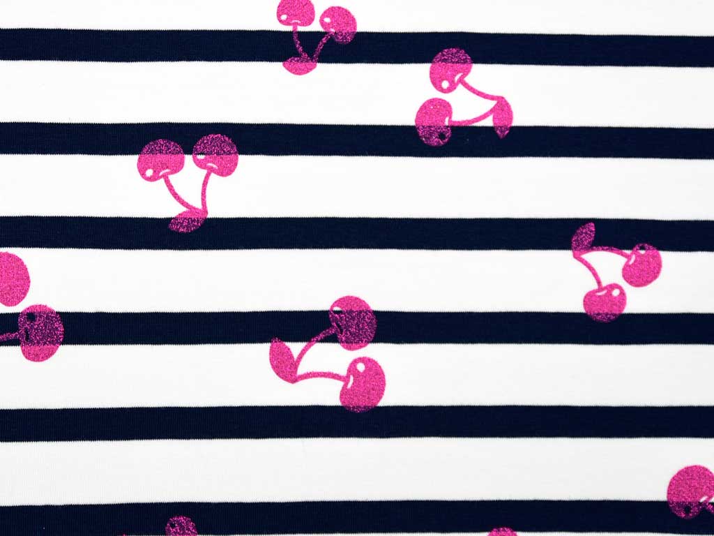 Ein weicher Baumwolljersey mit maritimen Streifen in dunkelblau-weiß und mit pinkem Glitzer überzogenen Kirschen.