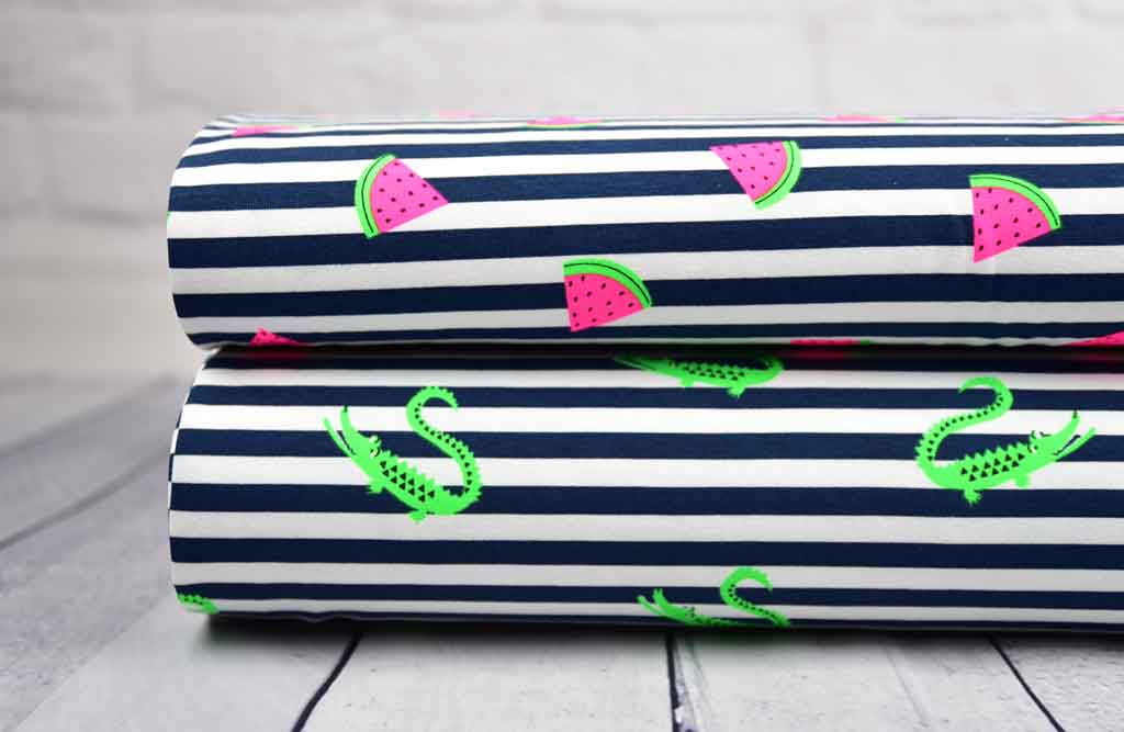 Ein dunkelblau-weiß gestreifter Jersey mit neongrünen Krokodilen. Die Streifen sind 8mm breit und die Krokodile ca. 5cm groß.