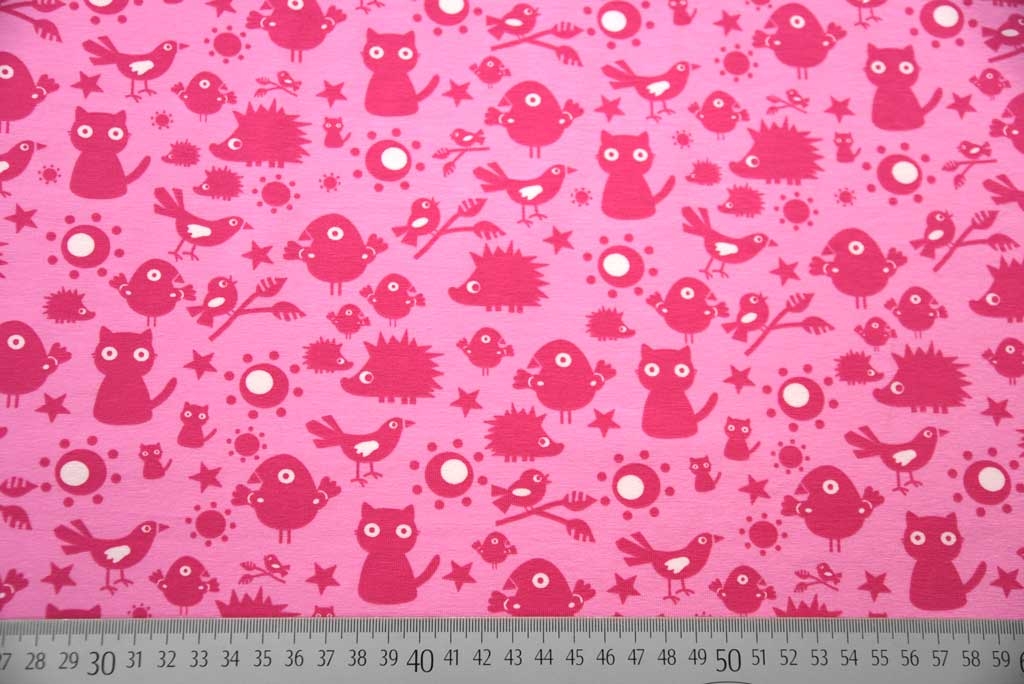 Ein weicher, rosa Baumwolljersey von Bienvenido Colorido aus der Kollektion See You mit dunkelrosa Tieren wie Igeln, Katzen und Vögeln. Dieser Stoff wird in dem Buch "Baby Leicht - Nähen mit Jersey" von Klimperklein verwendet.