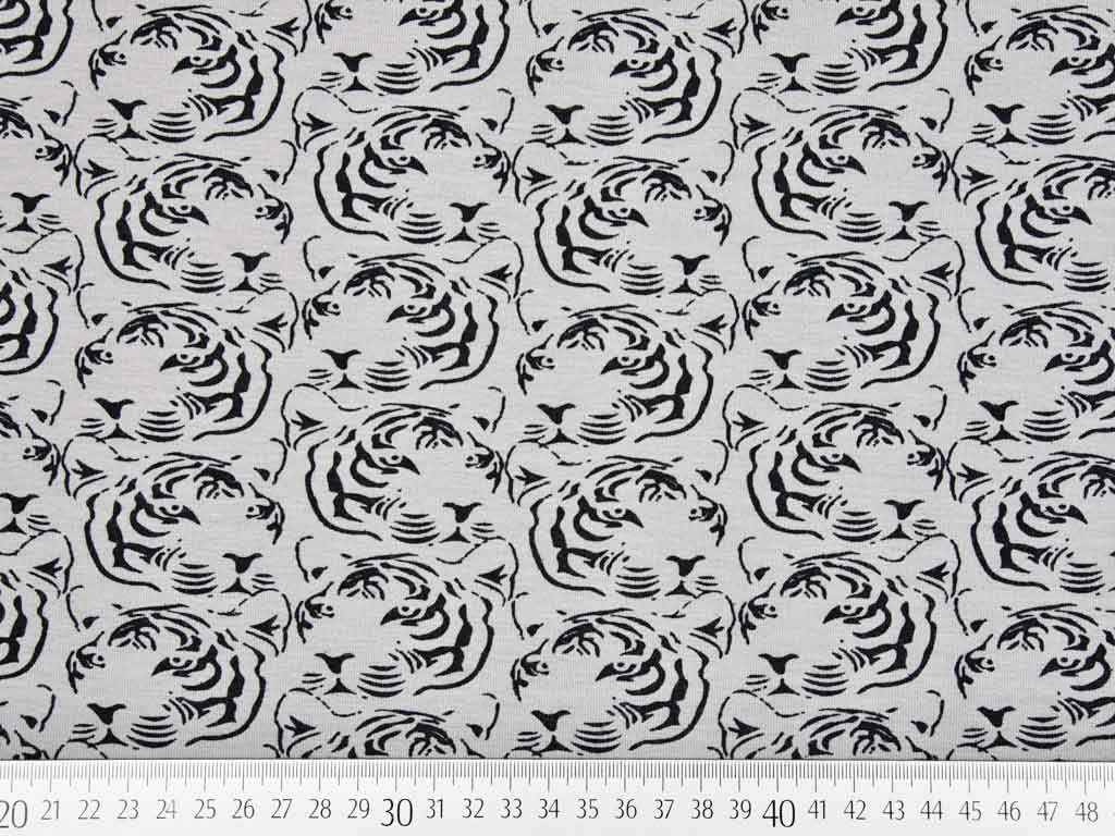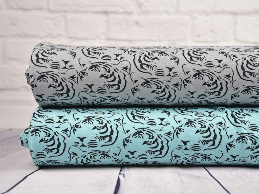 Von Ilja Fabrics ein weicher Jersey aus hochwertiger Kompaktbaumwolle in mint mit schwarzen Tigerköpfen.