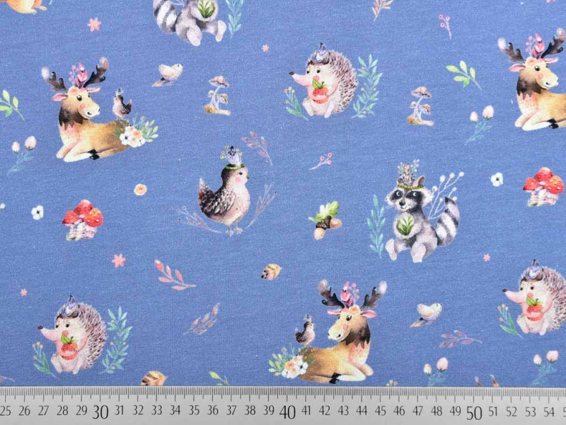 Ein weicher jeansblauer Baumwolljersey mit einem romantischen Digitaldruck im Bohostil. Auf dem Jersey sind Vögel, Igel, Hirsche, Eichörnchen und Waschbären gedruckt, die einen süßen Federkopfschmuck tragen. Die Tiere sind umgeben von kleinen Blütenzweigen, Blümchen, Pilzen und fliegenden Vögelchen. Ein besonders schönes herbstliches Waldmotiv für einzigartige Kleidungsstücke!