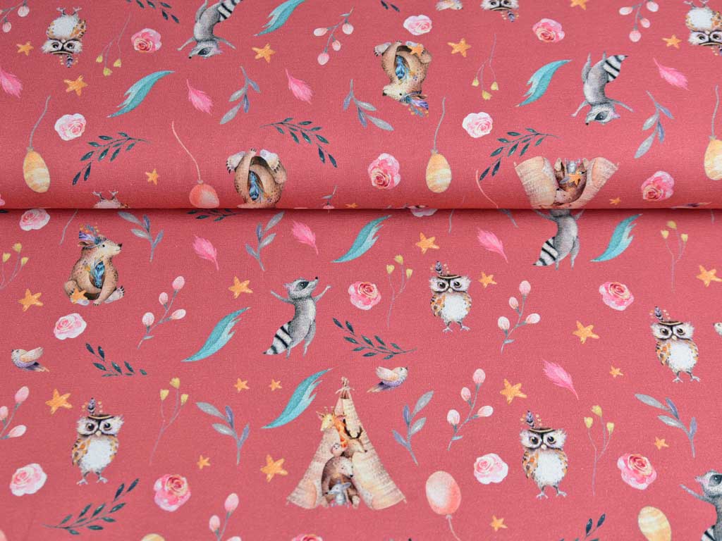Ein weicher Baumwolljersey in einem dunklen Koralleton mit einem romantischen Digitaldruck im Bohostil. Auf dem Jersey sind tanzende Waschbären, Eulen, Bären und Waldtiere im Tipizelt gedruckt. Die Tiere sind umgeben von kleinen Blütenzweigen, Blümchen, Luftballons und fliegenden Vögelchen. Ein besonders schönes herbstliches Waldmotiv für einzigartige Kleidungsstücke!