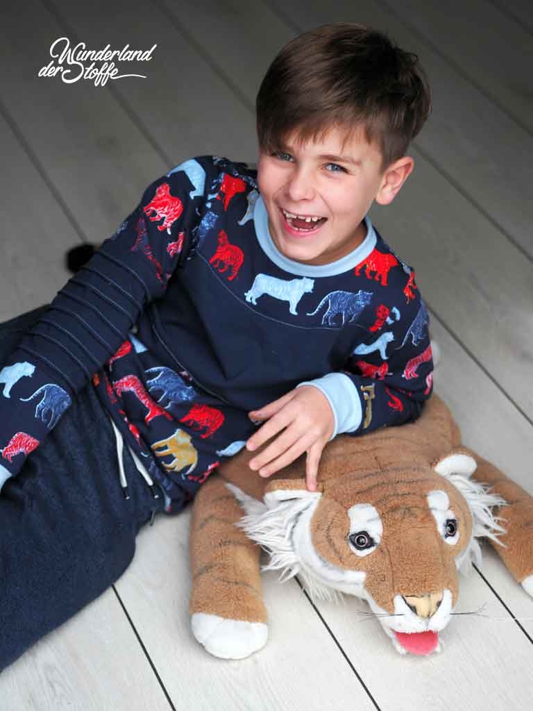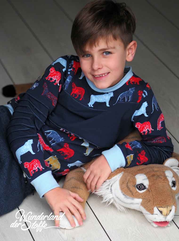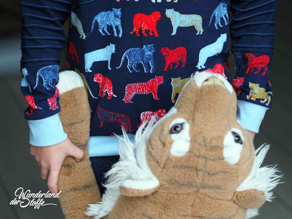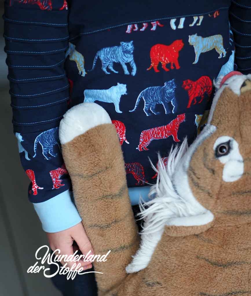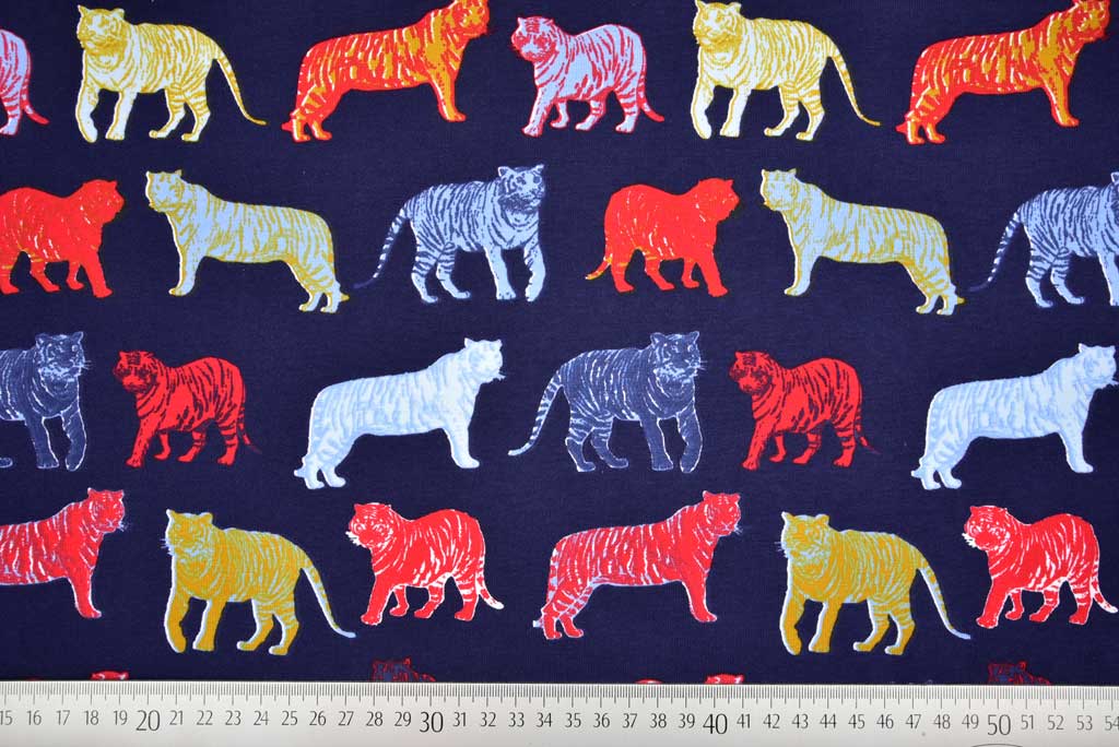 Ein weicher Baumwolljersey in dunkelblau mit bunten Tigern designed by Poppy.