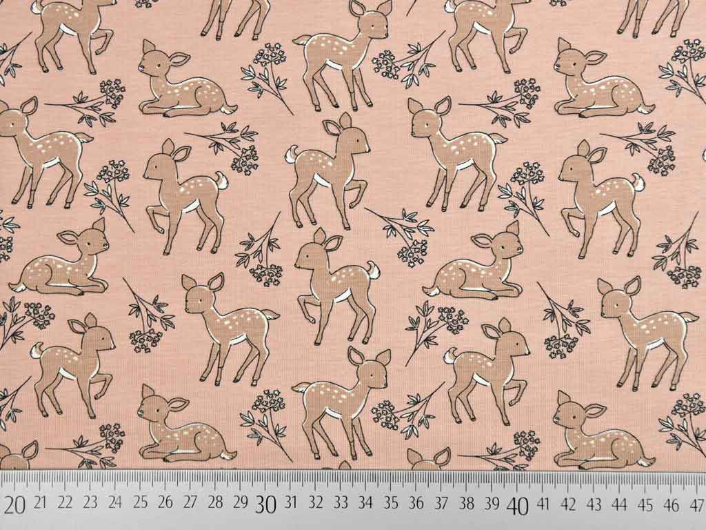 Ein altrosa Baumwolljersey mit kleinen, beigen Rehen und grauen Zweigen.