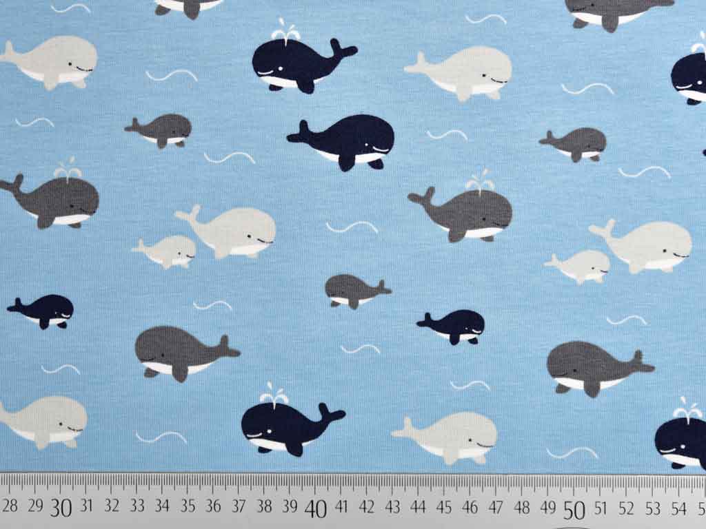 Ein hellblauer Baumwolljersey mit kleinen, grauen und weißen Walen sowie kleinen weißen Wellen. Perfekt für einen maritimen Look!