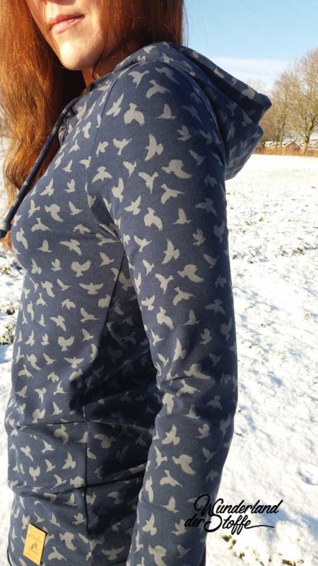 Ein weicher Baumwolljersey von Megan Blue in dunkelblau mit grauen Vögeln.