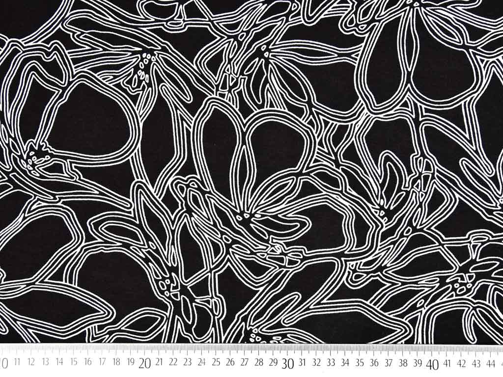 Ein weich fließender Viskose Jersey in schwarz weiß mit abstraktem Blumenmuster in weiß.