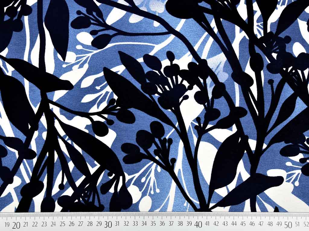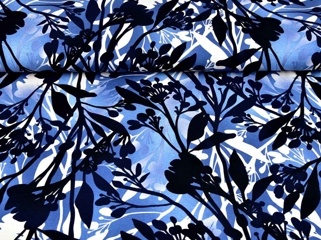 Ein weich fließender Viskose Jersey in jeansblau mit Blumen und Ranken in schwarz, dunkelblau und creme.